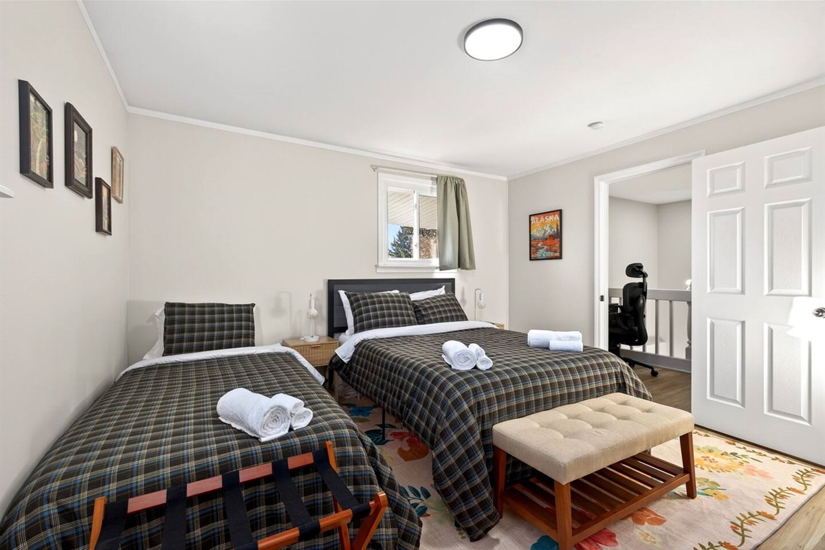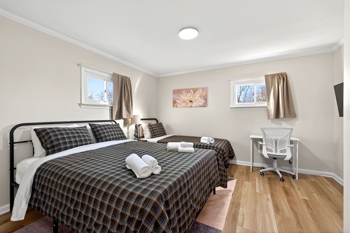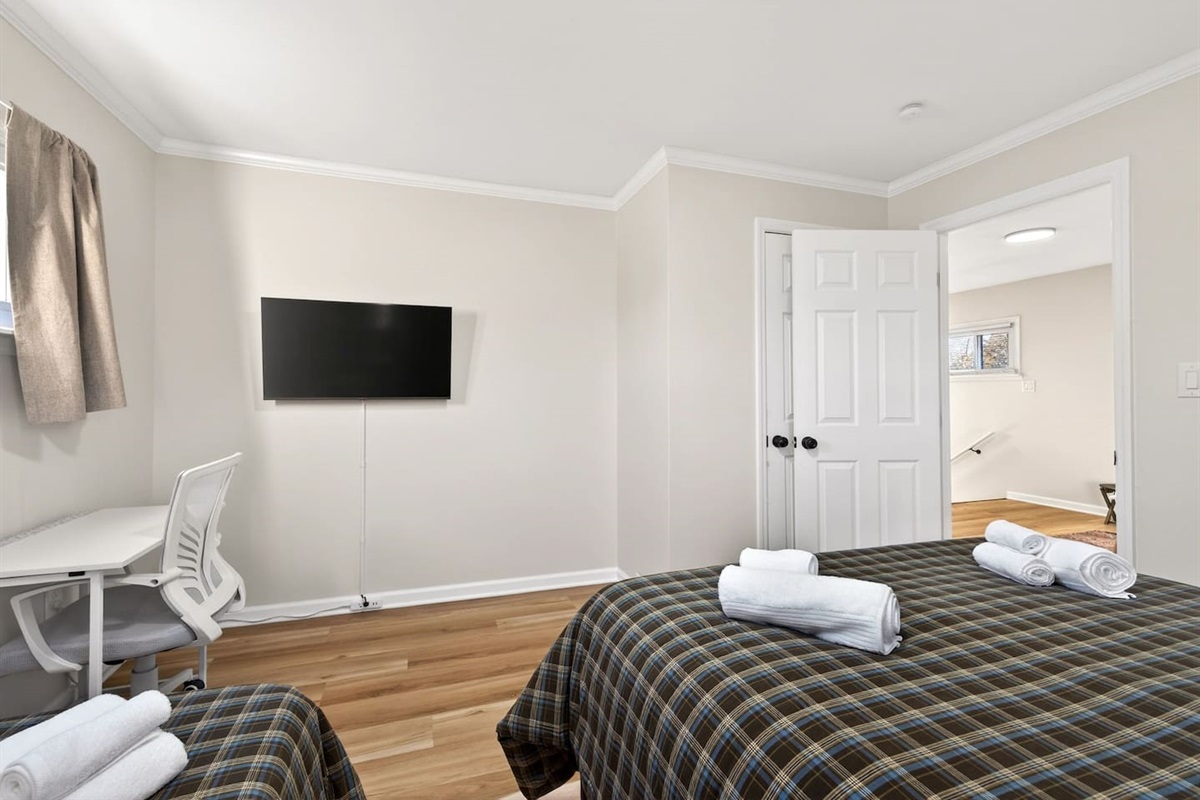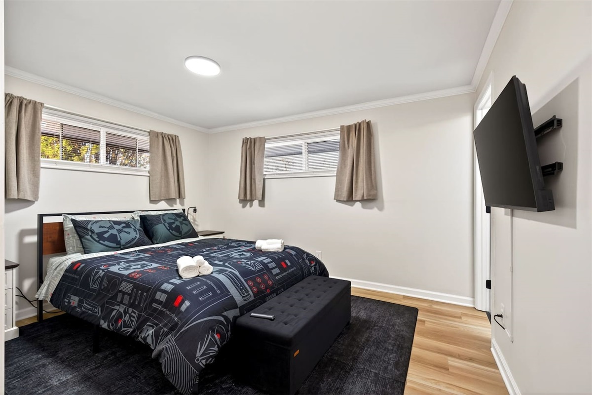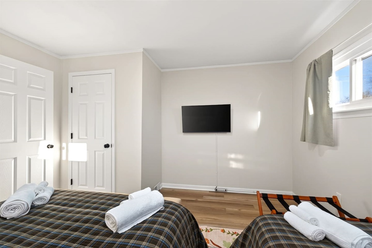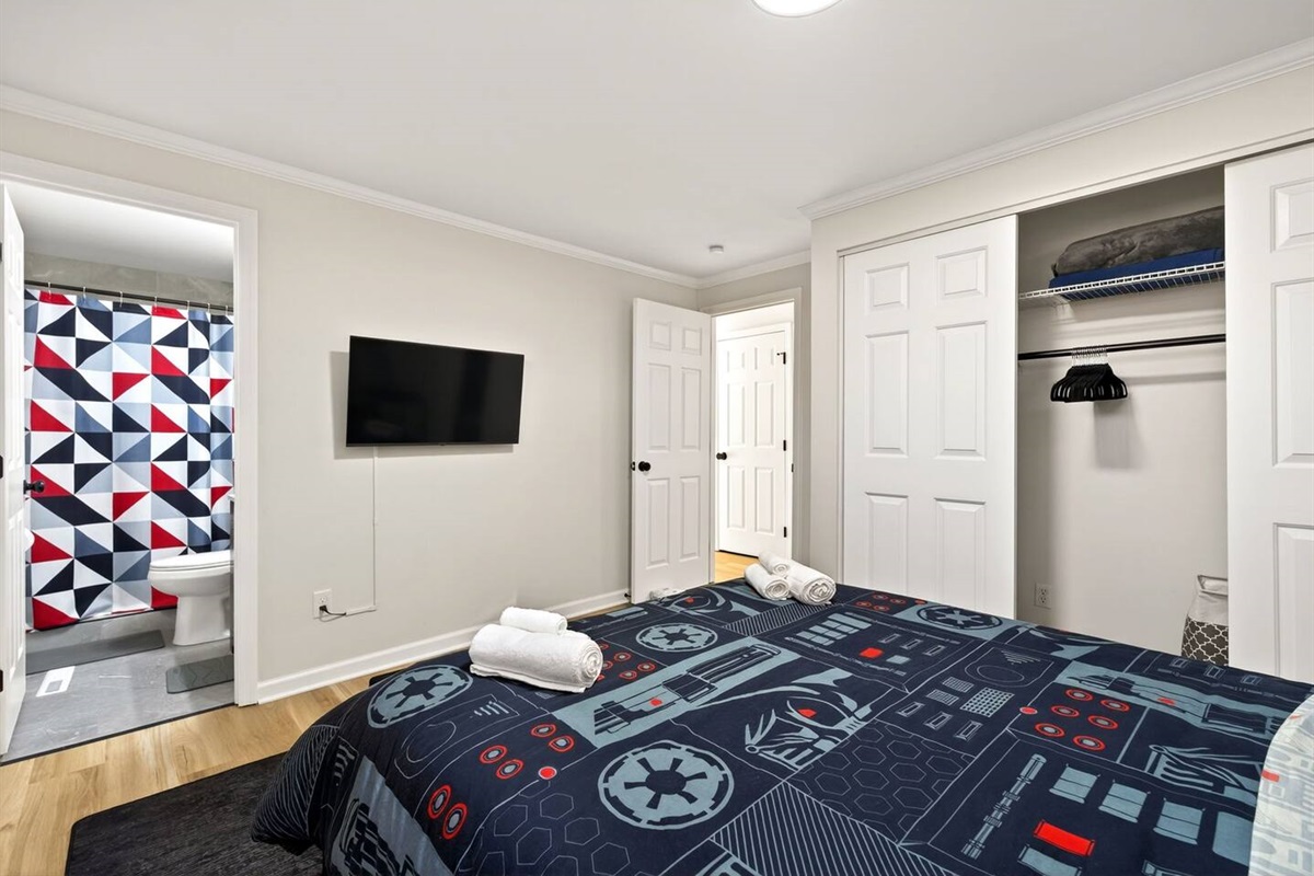 Bedroom 2: Queen bed, TV, closet with hangers