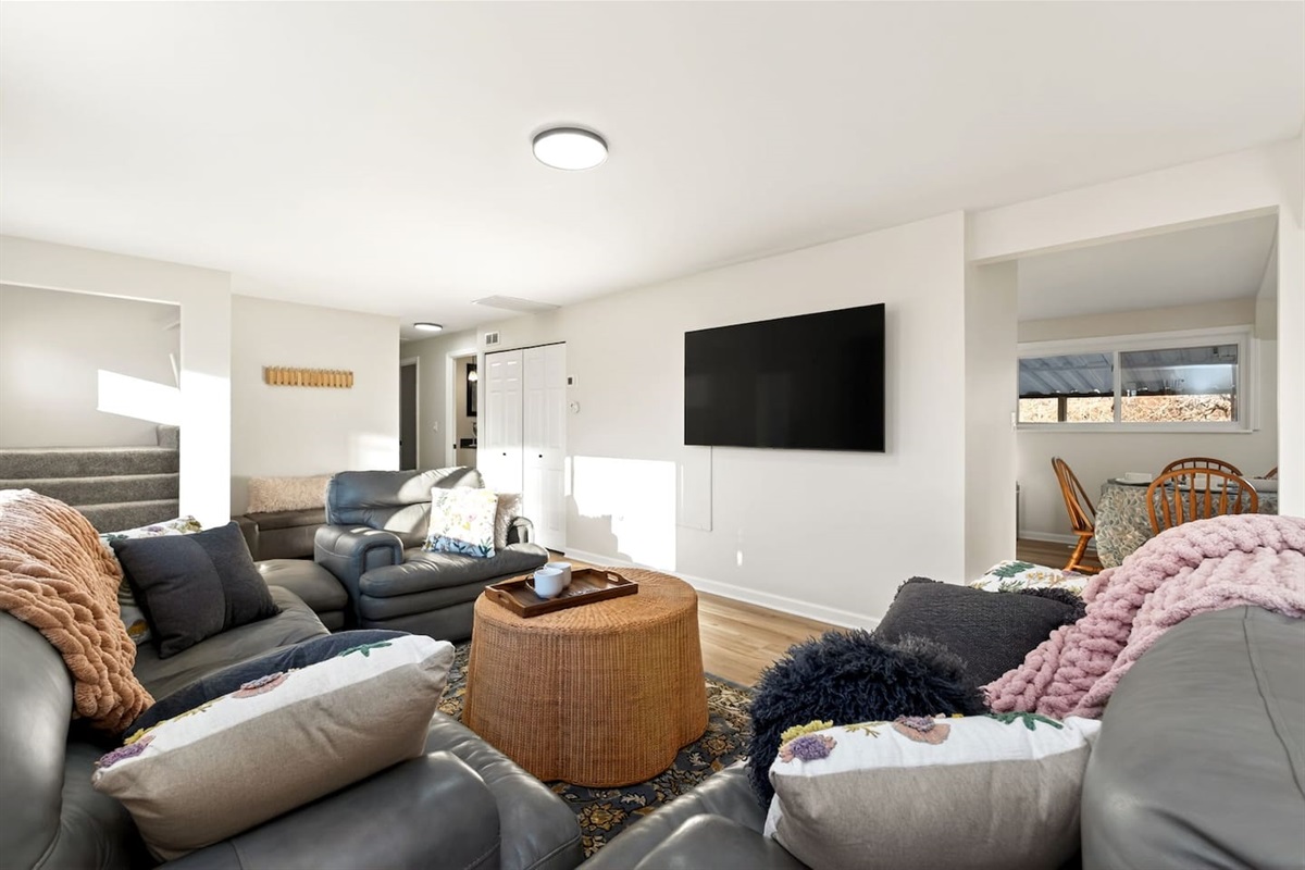 Comfortable living room with large TV & plush seating