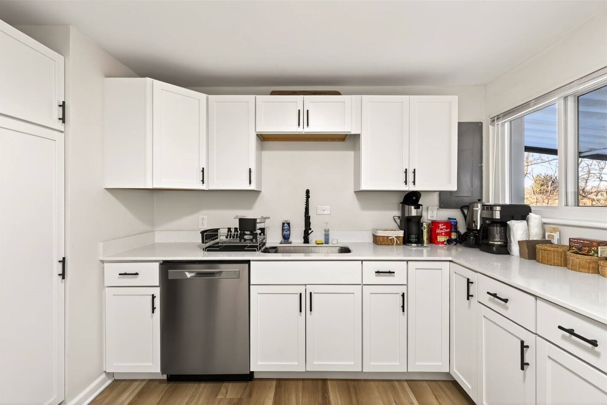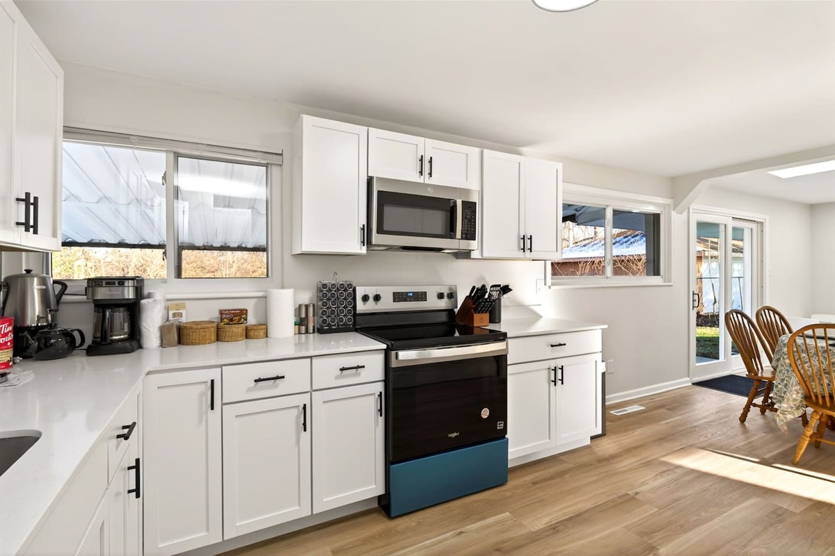 Kitchen includes cookware, microwave, full-size appliances, and Keurig coffee machine