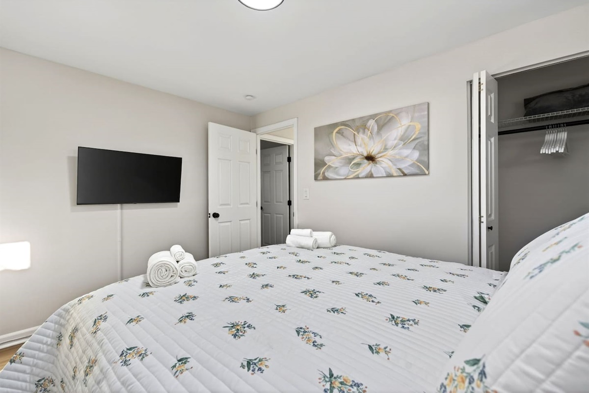 Bedroom 1: Queen bed, TV, closet with hangers